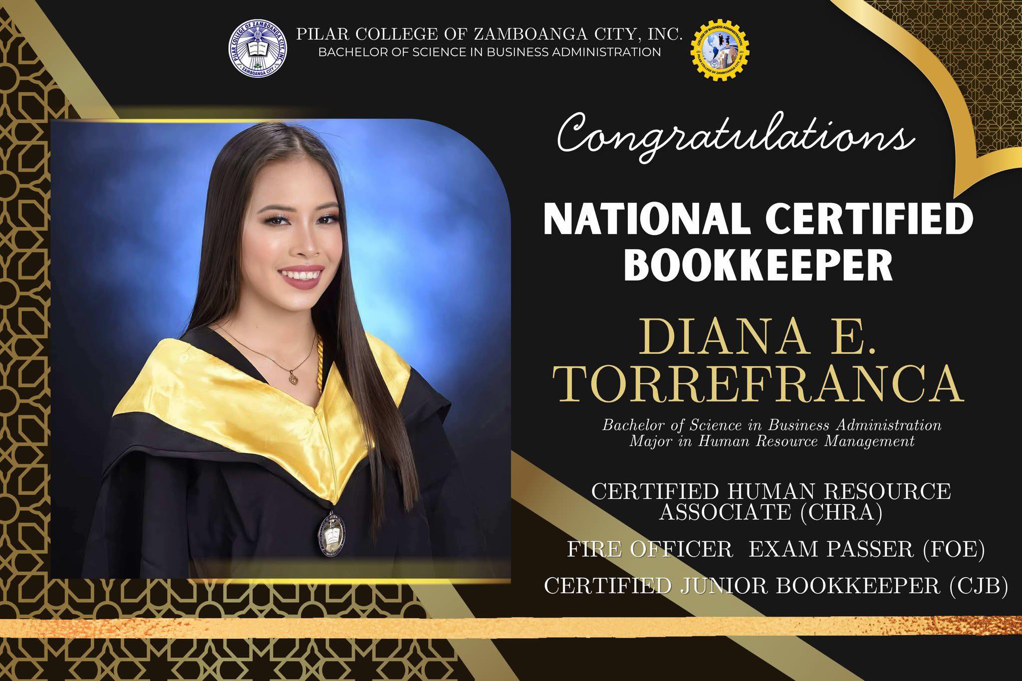 Congratulations to 𝐃𝐢𝐚𝐧𝐚 𝐄. 𝐓𝐨𝐫𝐫𝐞𝐟𝐚𝐧𝐜𝐚, our proud Bachelor of Science in Business Administration graduate, majoring in Human Resource Management, for becoming a 𝗡𝗮𝘁𝗶𝗼𝗻𝗮𝗹 𝗖𝗲𝗿𝘁𝗶𝗳𝗶𝗲𝗱 𝗕𝗼𝗼𝗸𝗸𝗲𝗲𝗽𝗲𝗿!